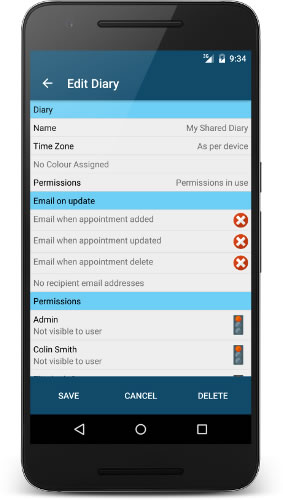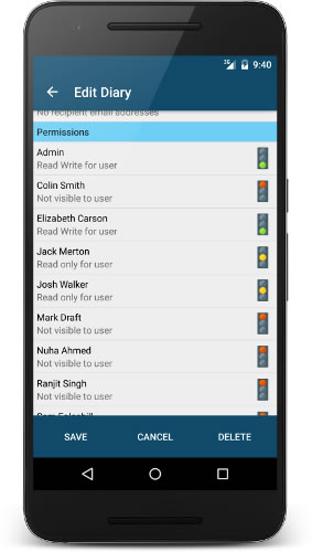 To change the permission for a given user, tap the user's name in the list. Tapping the name will toggle permissions for the user in question between "Not visible to user" (denoted by a red traffic light), "Read only for user" (denoted by a yellow traffic light), and "Read Write for user" (denoted by a green traffic). Keep tapping users until you've set up the permissions you require. Once you're happy with the permissions you've assigned, press the "Save" button to save the changes you've made to the calendar.