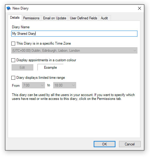 Now enter your preferred name for this Calendar in the "Calendar Name" field. Before you click "OK", take a look at the text in the middle of the dialog, below the "Display Events in a custom colour" fields. This shows that the Calendar you are about to create will be shared with all the users in your account, and those users will be able to both "read" from it and "write" to it. For those not familiar with permissions systems, "Read" (or "Read Only") means a user will be able to see the data in the Calendar in question, but will not be able to alter it. "Write" (or "Read\Write") means a user will be able to be both see the data, and also edit it. Now, click "OK".