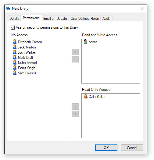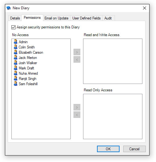 With the checkbox checked, three lists appear on the Permissions tab. These are named "No Access", "Read and Write Access", and "Read Only Access". Users listed in the "No Access" list are unable to see this Calendar, those in the "Read and Write Access" list can see the Calendar and create, edit and delete events in this Calendar, and those in "Read Only Access" can see the events in this Calendar, but cannot change them. As we can see, when we first check the "Assign security permissions to this Calendar" checkbox, all the users in the account are in the "No Access" list, so if we press "OK" now, no-one will be able to see the Calendar.