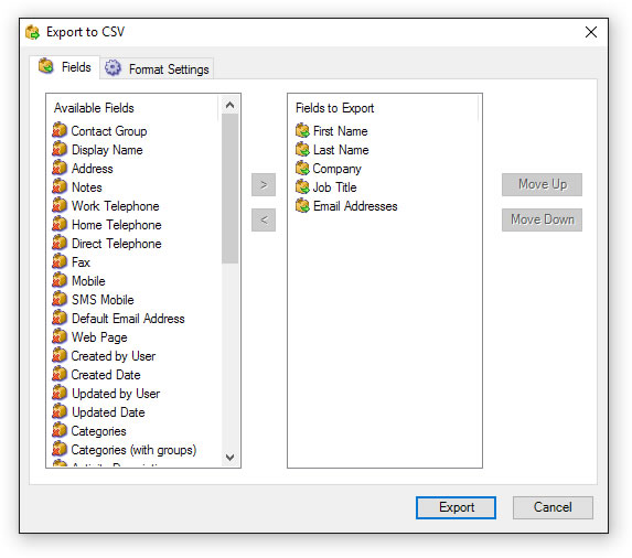 After selecting the events, contacts or tasks you wish to export, the "Export to CSV" dialog will appear. This dialog is comprised of two lists, the "Available Fields" list, and the "Fields to Export" list. Fields listed in the "Available to Export" list are fields which are not currently included in the export, but could be included if so desired. Fields listed in the "Fields to Export" list are fields which are currently included in the export. The "Fields to Export" list is displayed in the order in which the columns will appear in the exported CSV file.