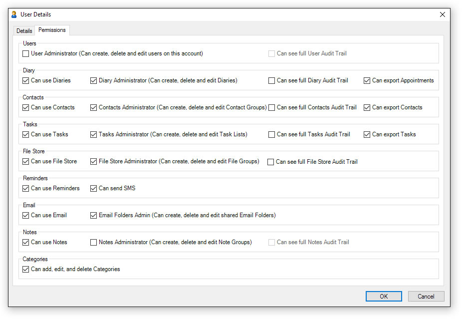 MyOffice allows you to assign various permissions to users in order to restrict what they can do. These can be found in the Permissions tab of the User Details dialog, as accessed from User Admin. The screenshot below shows this tab. If you're unsure as to how to open user admin, refer to How to create, edit, and delete users.